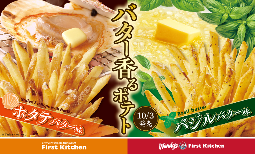 - 10月3日(木)から、ウェンディーズ·ファーストキッチンとファーストキッチン(競馬場店を除く)にて、食欲の秋にぴったりなフレーバー(味付き)ポテト「バジルバター味ポテト」と「ホタテバター味ポテト」を新発売します。新商品のバター香るポテトは、秋から冬の寒くなる季節に向けて恋しくなる、こってり感やコクが楽しめる「バター」をテーマに開発。バジルバターは、ファーストキッチンで25年以上前に誕生した歴史あるフレーバー「初代バジルポテト」を、ホタテバターは一番人気の「焦がしバター醤油味ポテト」をベースにした商品です。当社の看板商品であり大人気の元祖フレーバーポテトは、今回の「バジルバター味ポテト」「ホタテバター味ポテト」で137·138種類目のフレーバーとなります。ぜひご賞味ください。また、10月3日(木)〜10月23日(水)の期間中、Xフォロー&リポストキャンペーンで新作ポテトの無料券プレゼントキャンペーンを実施します。こちらもぜひご参加ください。