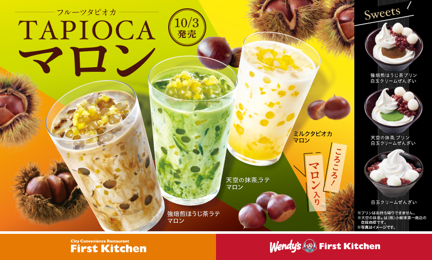 - 10月3日(木)から、ウェンディーズ·ファーストキッチンとファーストキッチン(競馬場店を除く)にて、コロコロとした食感が楽しい「マロンタピオカ」3種を発売します。秋の味覚「マロン」と相性抜群の強焙煎ほうじ茶や、天空の抹茶®をベースにしたラテなどに、もちもち食感のタピオカを組み合わせました。ウェンディーズとファーストキッチンでは、ミルクやセブンアップをベースに、ストロベリーやマンゴーを組み合わせた「フルーツタピオカ」や、黒糖ラテをベースに天空の抹茶®や強焙煎ほうじ茶など、本格的な茶葉の味わいが楽しめる「黒糖ラテタピオカ」をラインナップしています。バラエティー豊かな全10種類のタピオカドリンクをお楽しみください。