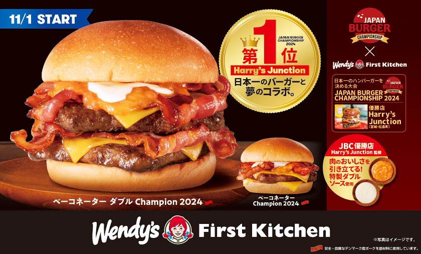 11月1日(金)から、ウェンディーズ・ファーストキッチンとファーストキッチン(競馬場店を除く)にて、全国から集結した人気グルメバーガー店が競うフードスポーツの大会『JAPAN BURGER CHAMPIONSHIP 2024』にて優勝を果たした、宮城・松島町のグルメバーガー店「ハリーズジャンクション」とのコラボバーガーを販売します。ハリーズジャンクションの特製ダブルソースの味わいを監修いただき、ウェンディーズとファーストキッチンで再現!それぞれの看板メニューと組み合わせたオリジナル商品が誕生しました。アメリカウェンディーズで愛されていて、日本でも大人気の「ベーコネーターUSA」と、ファーストキッチンの創業当初より親しまれている「ベーコンエッグバーガー」と組み合わせた、夢のコラボバーガーです。ぜひこの期間でしか味わうことのできない限定商品をお試しください。また、11月1日(金)〜11月7日(木)の期間中、Xフォロー&リポストキャンペーンで新商品の無料券プレゼントキャンペーンを実施します。こちらもぜひご参加ください。