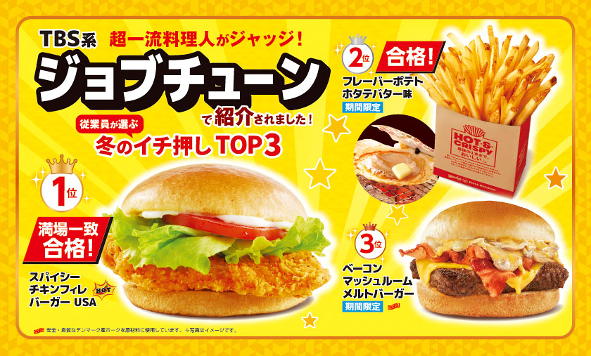 202412.28 TBS系ジョブチューンに紹介されました! 従業員が選ぶ冬のイチ押しを超一流料理人がジャッジ! 【冬のイチ押しTOP3】 ・スパイシーチキンフィレバーガーUSA ・フレーバーポテトホタテバター味ポテト ・ベーコンマッシュルームメルトバーガー あなたも是非、この美味しさを実際に味わってジャッジしてみてください。 【12/18〜】『ピカピカ・わくわくお... 【1/16(木)〜】卵黄たっぷり! 「太...