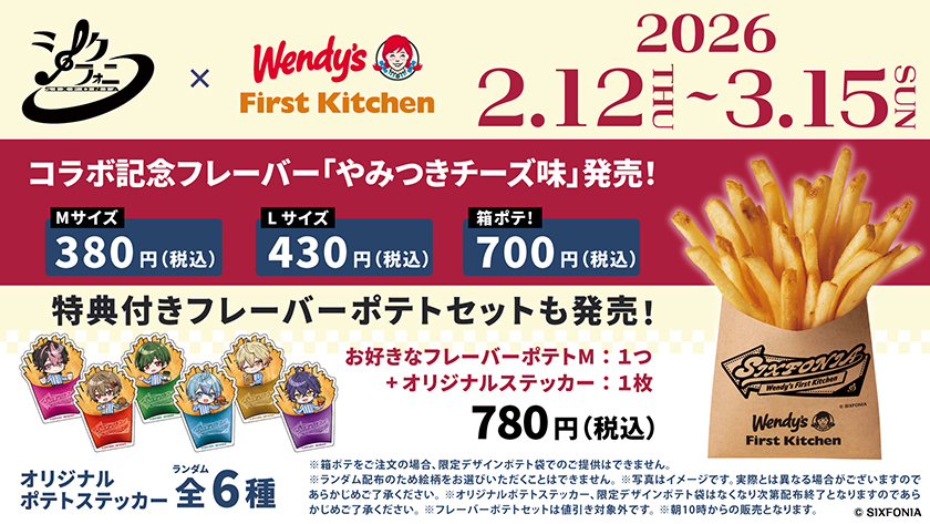 - 2月12日(木)より、ウェンディーズ・ ファーストキッチンとファーストキッチン(競馬場店を除く)で、『シクフォニ』とのコラボキャンペーンを開催します。コラボを記念して、シクフォニをイメージした「シクフォニコラボ!やみつきチーズ味」ポテトの販売、オリジナル描き下ろしイラストを使用した、「オリジナルポテトステッカー」とお好きなフレーバーポテトMセット780円(税込)を3月15日(日)までの期間中、数量限定で販売します。数に限りがありますのでお早めにご来店ください。また、5店舗限定でコラボメニュー、コラボグッズなど盛りだくさんの内容を実施します。ぜひ『シクフォニ』とのコラボレーションをお楽しみください。